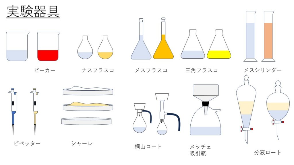 🔍 収録されている実験器具 ナスフラスコや三角フラスコなど