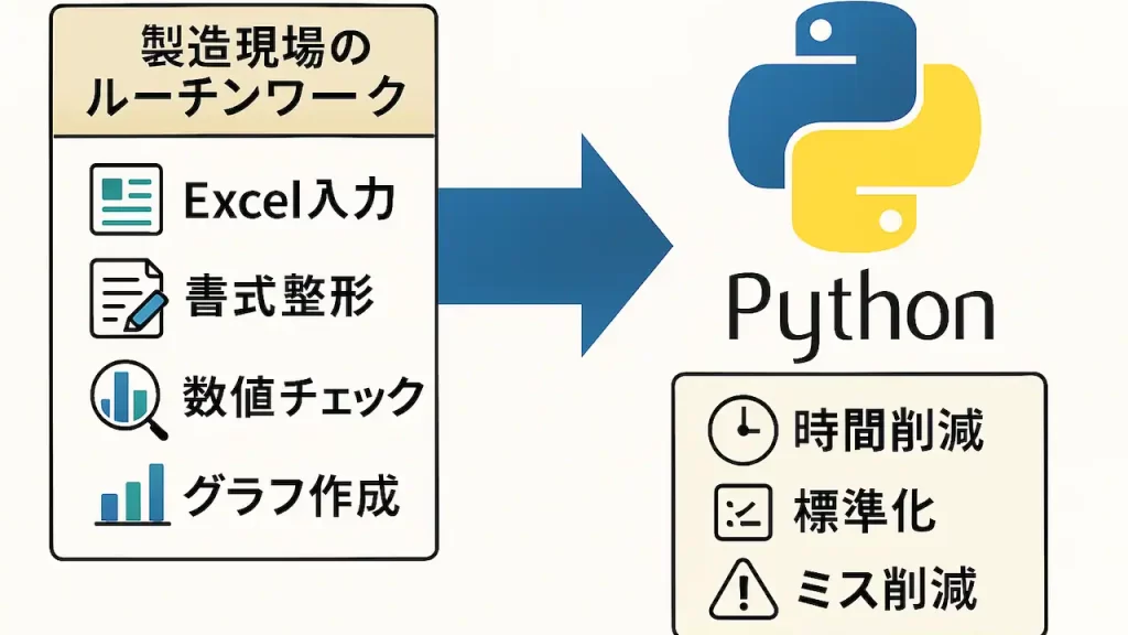 この記事では、製造現場にありがちな作業を「どこでも再現できる形」に一般化して、Python自動化の考え方と実装例をまとめる。